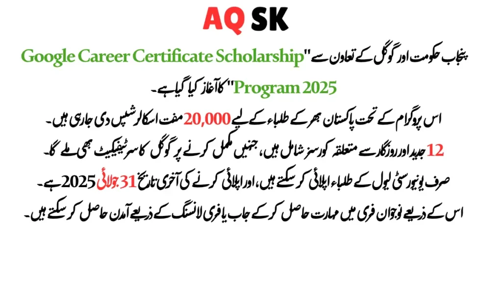 The Google Career Certificate Scholarship Program 2025 in Pakistan is a golden opportunity for students to advantage excessive-value virtual competencies for free of charge. With 20,000 scholarships to be had, this initiative supports kids empowerment, profession readiness, and economic boom. If you’re a university student, don’t omit the danger to apply before 31 July 2025.
